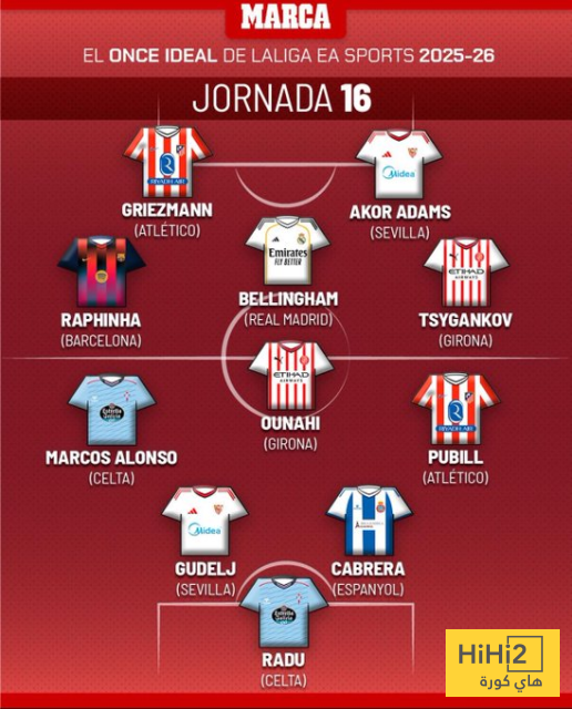 كشفت صحيفة ماركا الإسبانية، عن التشكيلة المثالية للجولة السادسة عشرة من الدوري الإسباني، والتي ضمت تواجد نجم برشلونة رافينيا، ولاعب ريال مدريد بيلينجهام.