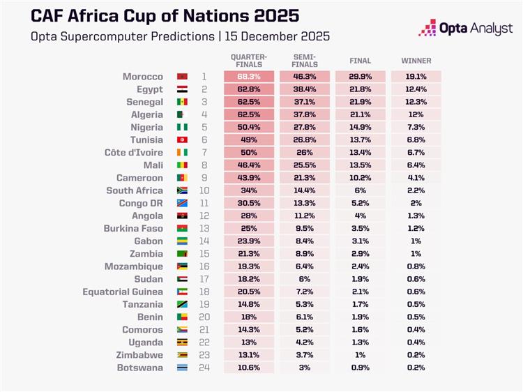 ووضعت أوبتا المنتخب المصري في المركز الثاني بين المرشحين للفوز بكأس أمم أفريقيا بنسبة 12.4%، خلف المغرب المرشح الأول للفوز باللقب، بحسب أوبتا، بنسبة 19.1%.