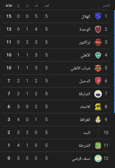 وحصل الهلال على النتيجة الكاملة (15 نقطة)، وسجل 15 هدفاً واستقبلت شباكه 5 أهداف أخرى.