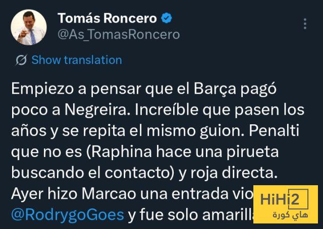 “بدأت أعتقد أن برشلونة دفع مبلغًا بسيطًا مقابل نيجريرا. من المدهش أن نفس القصة تتكرر عامًا بعد عام، ركلة جزاء خاطئة (قام رافينيا بحركة بهلوانية بحثًا عن الاحتكاك) وبطاقة حمراء مباشرة. بالأمس، تدخل ماركو بعنف على رودريجو ولم تكن سوى بطاقة صفراء”.
