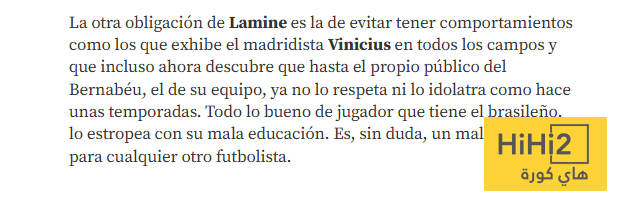 ويجب على لامين أن يتجنب السلوك الذي يتبناه لاعب ريال مدريد فينيسيوس في كل ملعب، وهو السلوك الذي حتى جماهيره في البرنابيو، جماهير فريقه، لم تعد تحترمه أو تقدره كما فعلت قبل عدة مواسم. كل الصفات الجيدة التي يمتلكها البرازيلي كلاعب ضاعت بسبب روحه الرياضية السيئة. إنه بلا شك مثال سيء لأي لاعب كرة قدم آخر.