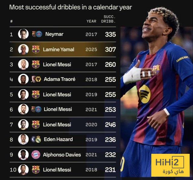 وحقق اللاعب الإسباني البالغ من العمر 18 عاما 307 مراوغات ناجحة في عام 2025، متجاوزا ميسي في عام 2017 (260).