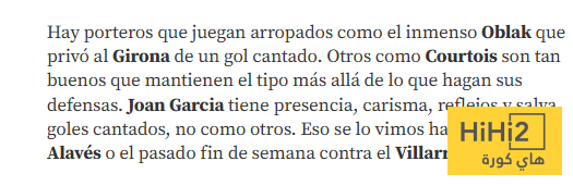 هناك حراس مرمى يتمتعون بدعم خاص، مثل العملاق أوبلاك الذي أنقذ أتلتيكو من هدف مؤكد أمام جيرونا، وآخرون، مثل كورتوا، الذين يتمتعون بمهارة فائقة تسمح لهم بالحفاظ على رباطة جأشهم بغض النظر عما يفعله مدافعوهم. هناك خوان جارسيا الذي يتميز بحضوره القوي وجاذبيته ورد فعله السريع وينقذ الأهداف الحاسمة على عكس حراس المرمى الآخرين. لقد رأيته يفعل ذلك ضد ألافيس وفي نهاية الأسبوع الماضي ضد فياريال.
