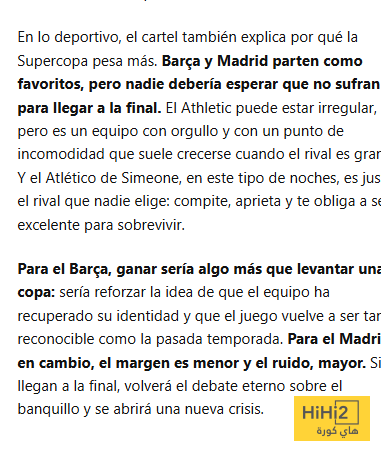 يبدأ برشلونة وريال مدريد كمرشحين للفوز بكأس السوبر، لكن لا ينبغي لأحد أن يتوقع منهم ألا يعانوا من أجل الوصول إلى النهائي. قد يكون فريق بلباو غريب الأطوار، لكنه مصدر إزعاج يميل إلى النمو عندما يكون المنافس كبيرًا. وأتلتيكو سيموني، في مثل هذه الليالي، هو الخصم الذي لا يريد أحد اختياره. إنهم يتنافسون ويضغطون عليك ويجبرونك على التفوق من أجل البقاء.