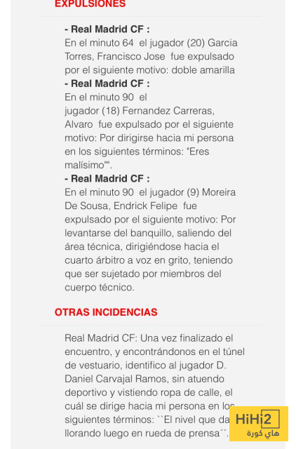 “وبعد انتهاء المباراة، وأثناء تواجدي في النفق المؤدي إلى غرفة تبديل الملابس، التقيت باللاعب السيد دانييل كارفاخال، الذي لم يكن يرتدي ملابس رياضية، بل ملابس عادية، وخاطبني قائلاً: