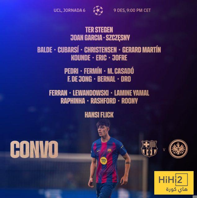 سالوت كورا – أعلن هانسي فليك، المدير الفني لفريق برشلونة، القائمة الرسمية لمواجهة آينتراخت فرانكفورت في الجولة السادسة من دور المجموعات بدوري أبطال أوروبا اليوم الثلاثاء.