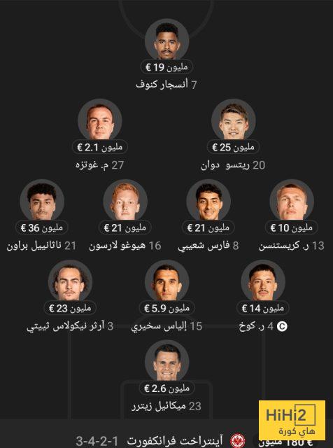 بلغت القيمة السوقية لتشكيلة فرانكفورت أمام برشلونة في دوري أبطال أوروبا اليوم 180 مليون يورو، موزعة بين اللاعبين على النحو التالي: