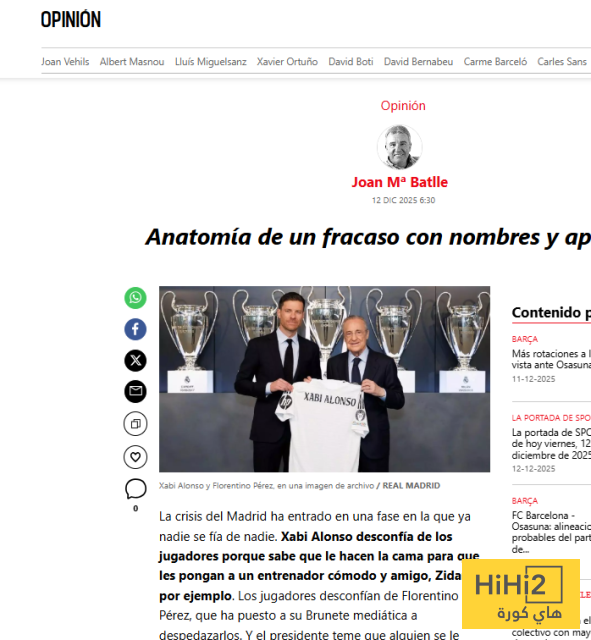 دخلت الأزمة في مدريد مرحلة لم يعد أحد يثق فيها بأحد. تشابي ألونسو يشكك في اللاعبين لأنه يعلم أنهم يحاولون إقالته وتعيين مدرب جديد لتدليلهم، زيدان على سبيل المثال. ويشعر اللاعبون بالقلق من فلورنتينو بيريز، الذي استخدم وسائل الإعلام لتمزيقهم. ويخشى الرئيس أن يخرج أحد عن السيطرة ويوجه أصابع الاتهام إليه. هذا هو تشريح الفشل بالأسماء والألقاب.