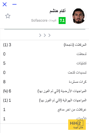 مرحبا كورة: أكام هاشم قدم أداء رائعا للعراق في الشوط الأول أمام الأردن، حيث كان له دور كبير في صناعة الفارق في خط الوسط، مما جعله أحد أبرز المؤثرين في أداء العراق في الدقائق الأولى من المباراة، بحسب تقييمه على موقع Sofa Score.