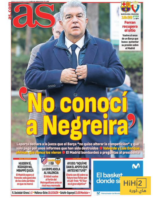 مرحبا كورة – تصدر خوان لابورتا الغلاف الأمامي لصحيفة AS الإسبانية بعد الكشف عن شهادته في قضية نيغريرا، والتي قدمتها أمس أمام محكمة العدل في برشلونة.